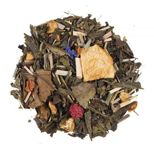 Grüner Tee China Sencha*, Apfel*, Dattel (Dattel, Reismehl)*, Lemongras*, Weißer Tee Pai Mu Tan*, Schwarzer Tee Golden Yunnan OP*, Apfelecken*, natürliches Mango Aroma, natürliches Erdbeer Aroma, rote Johannisbeere*, Holunderblüten*, Aroniabeere*, Erdbeere*, natürliches Zitronen Aroma, Kornblumen blau*. *Aus kontrolliert biologischem Anbau