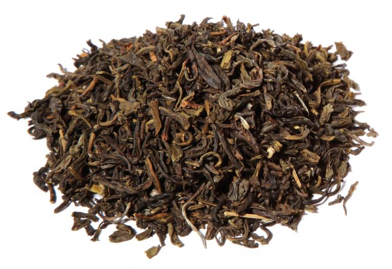 Grüner Tee mit leichtem, aromatischem Jasmingeschmack. Goldgelbe Tasse. Aus kontrolliert biologischem Anbau
